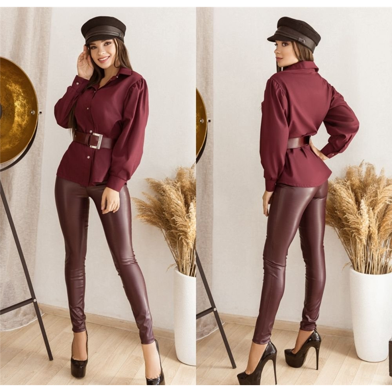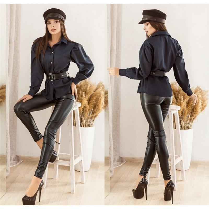 Размер: 44-46 Стильный комплект из облегающих брюк и коттоновой рубашки с широким поясом. Ткань: экокожа, коттон Цвета: беж/шоколад, марсала/марсала, тёмно-синий/чёрный Длина норма (42-44, 44-46): *рубашка спереди/сзади - 65 см. /70 см. , *рукав - 50 см. + манжет 7 см. *ширина плеча - 15 см. *штанина - 103 см. , *штанина по внутреннему шву - 79 см Мод:172