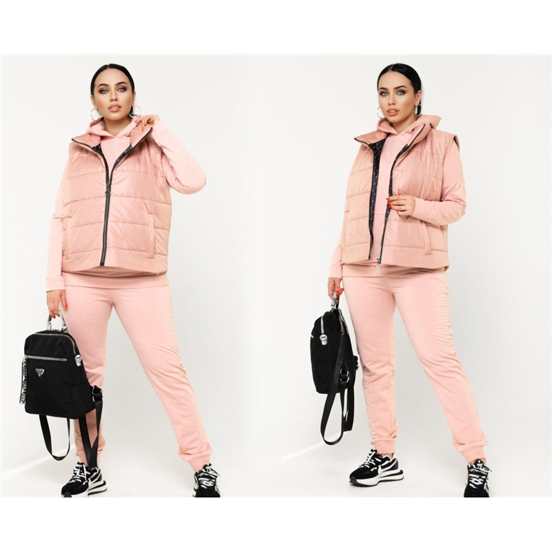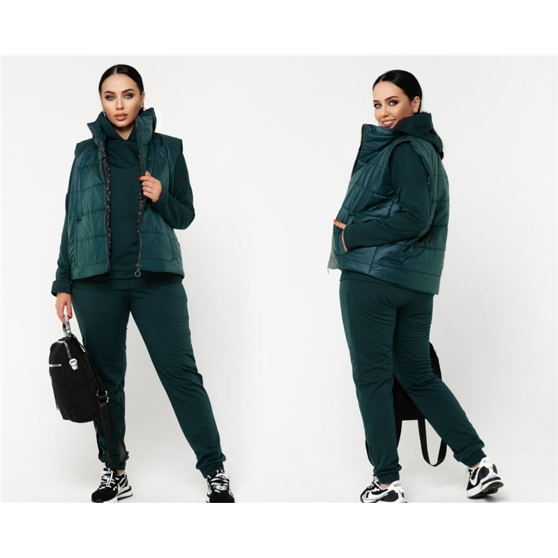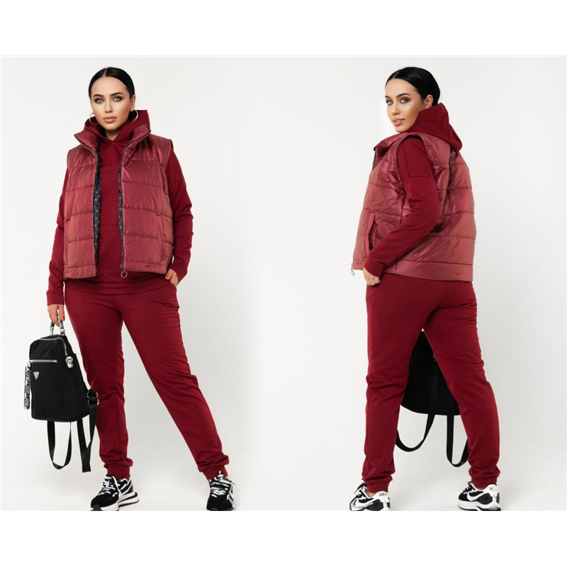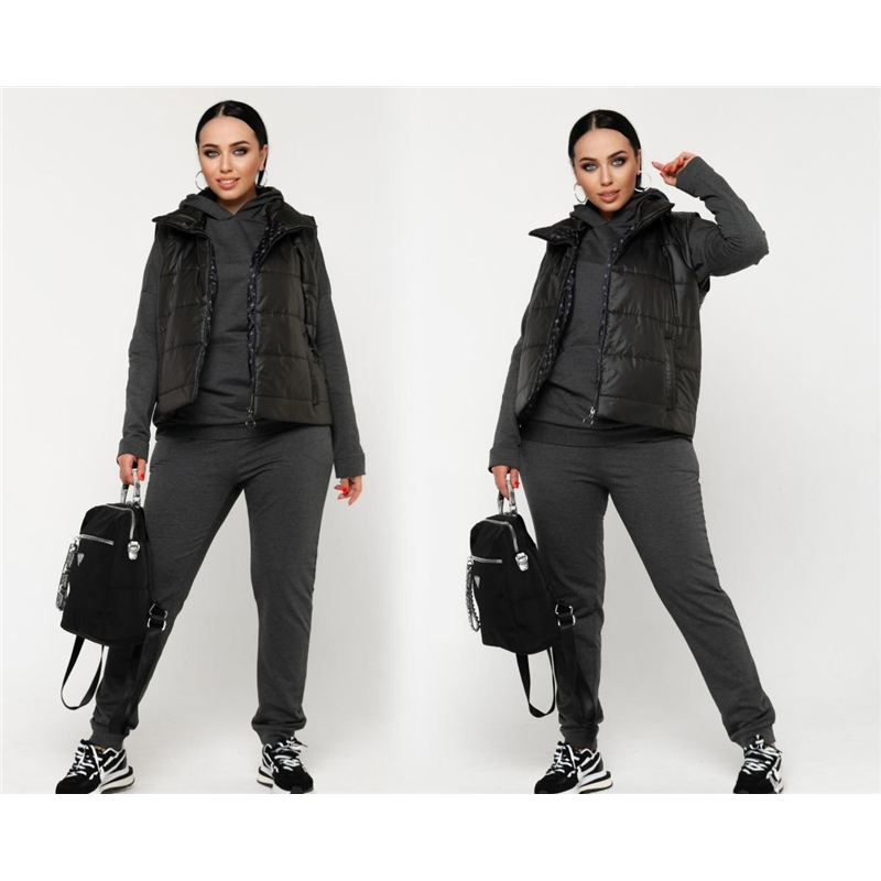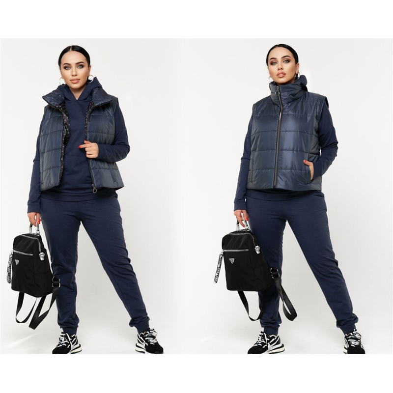 Размер: 46-48 Костюм тройка Удобный , теплый спортивный костюм. Кофта с капюшоном , карман кингуру. Брюки с карманами , на манжете. Жилетка на молнии с карманами, воротник стойка. Ткань :трехнитка на флисе хорошая растяжимость + Плащевка наполнитель синтепон 150 на подкладке Длина кофты : 74 см. Длина рукава кофты : 76 см. ( от горловины) Длина брюк : 105 см. (пояс на резинке) Длина жилета : 65 см модель 6910 -1