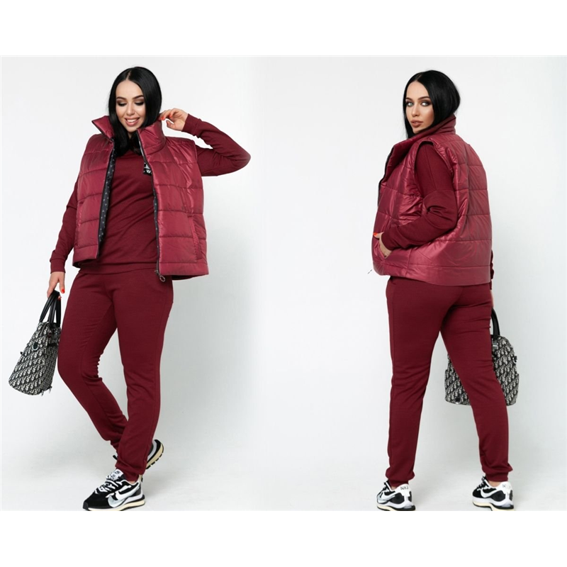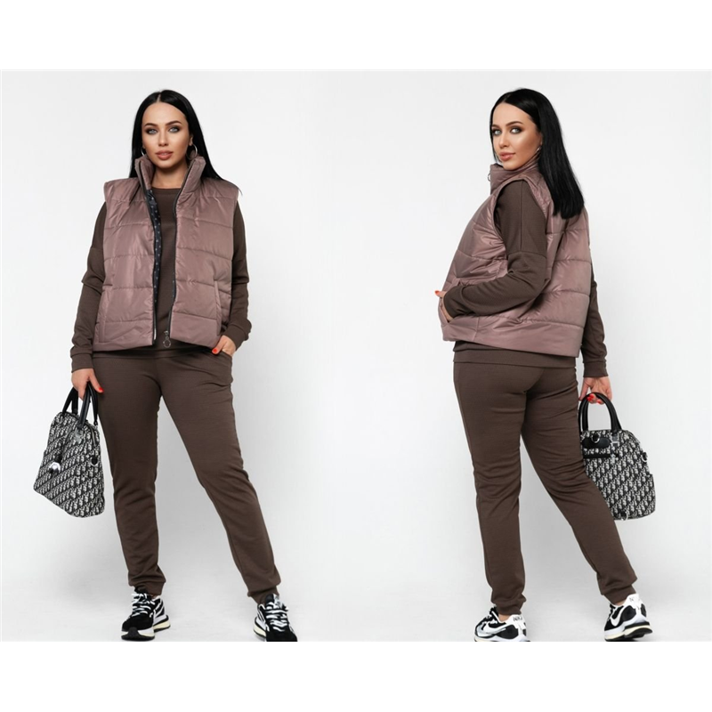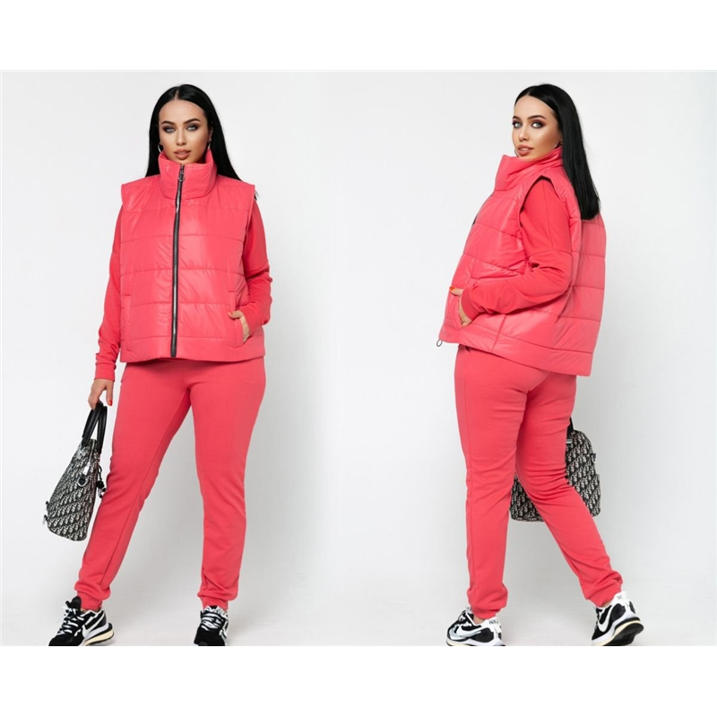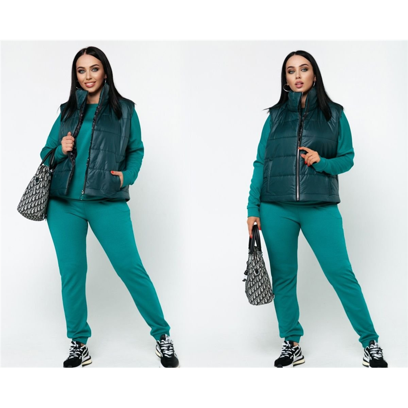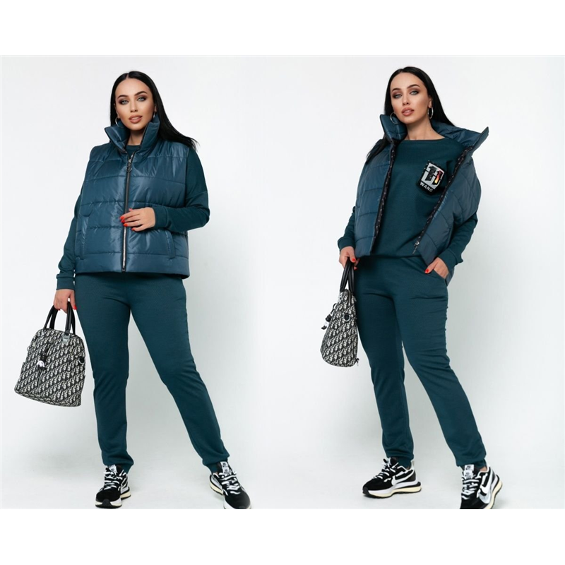 Размер: 46-48 Костюм тройка Удобный спортивный костюм. Кофта с аппликацией. Брюки с карманами , на манжете. Жилетка на молнии с карманами, воротник стойка. Ткань : фактурный трикотаж хорошая растяжимость + Плащевка наполнитель синтепон 150 на подкладке Длина кофты : 74 см. Длина рукава кофты : 76 см. ( от горловины) Длина брюк : 105 см. (пояс на резинке) Длина жилета : 65 см модель 6909 -1