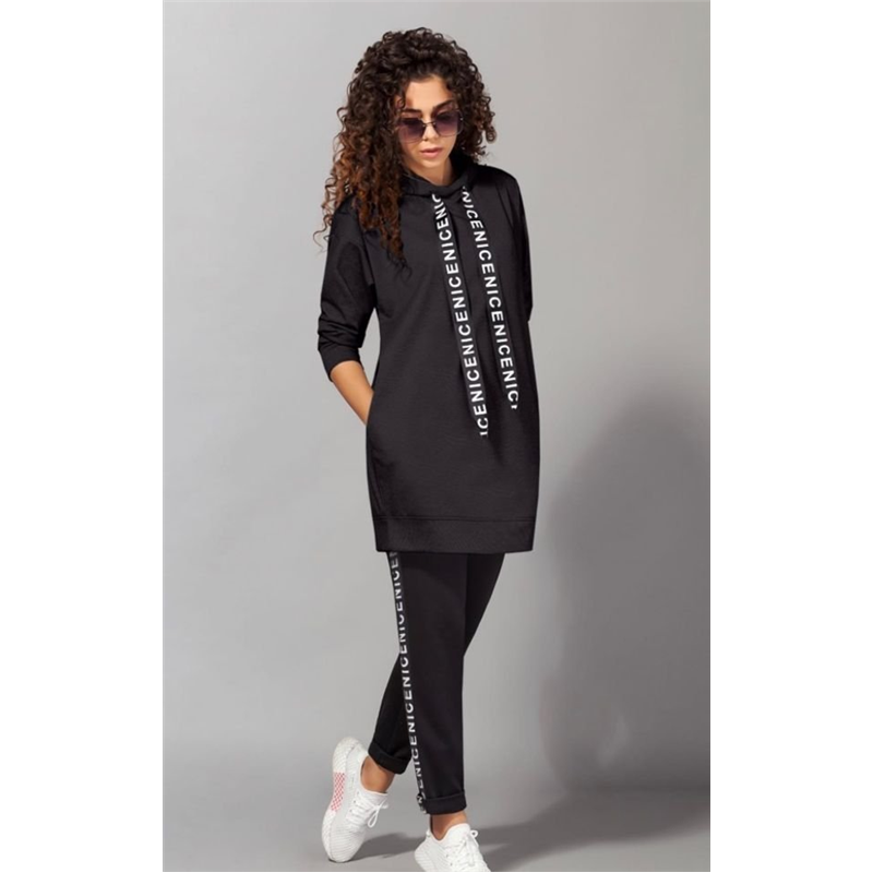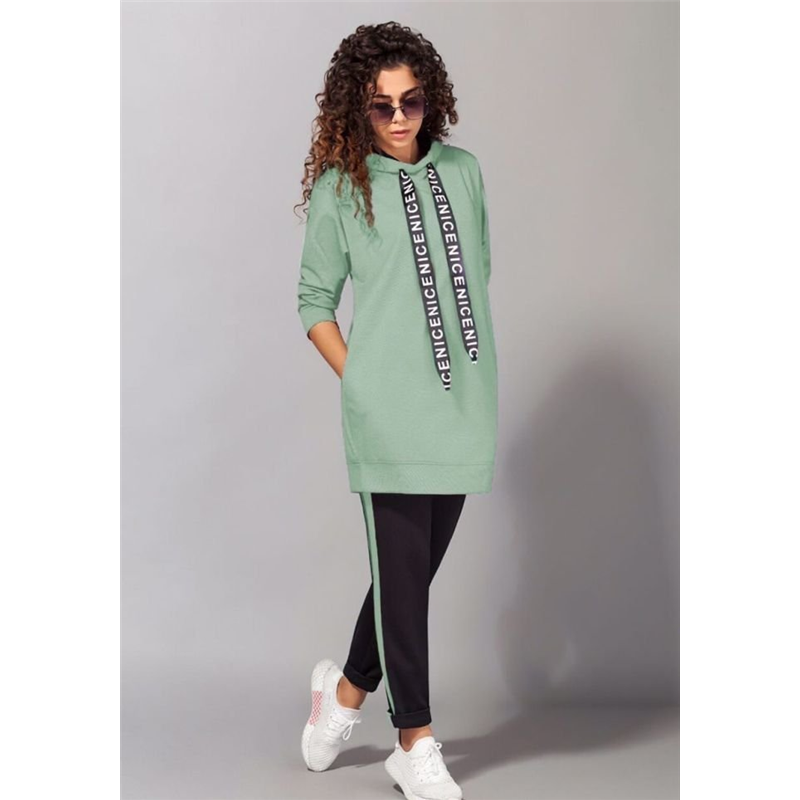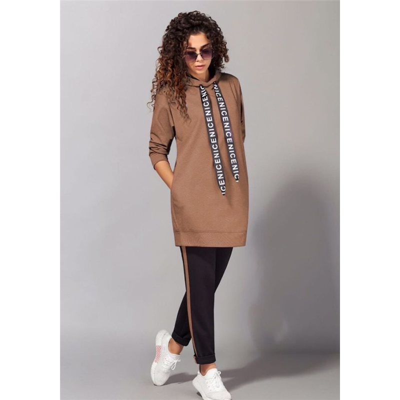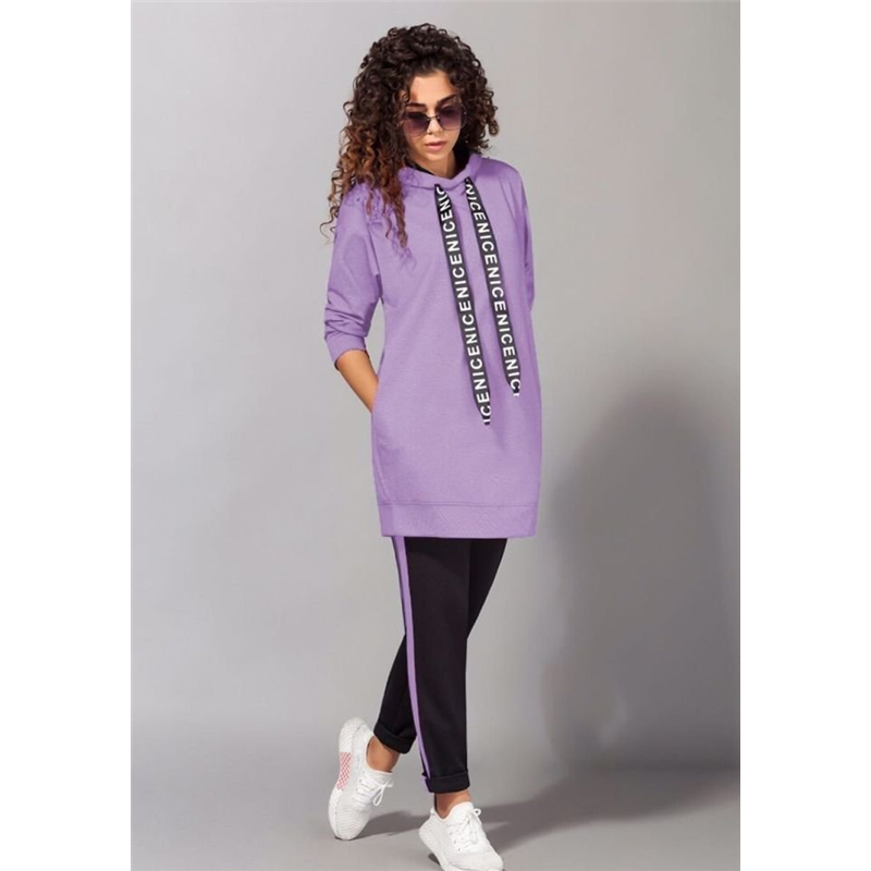 Размер: 42-44, 46-48 Ткань двунитка турция Костюм состоит из брюк с высокой посадкой, пояс на резинке Кофта удлиненная, боковые карманы, капюшон двойной, внутри цвета штанов Цвет сирень, оливка, мокко и чёрный, штаны черные модель 804