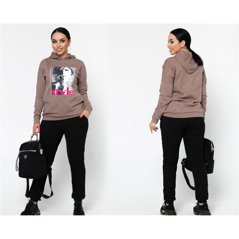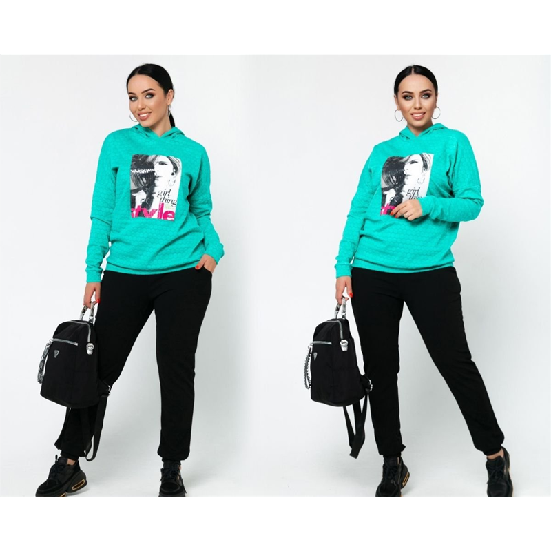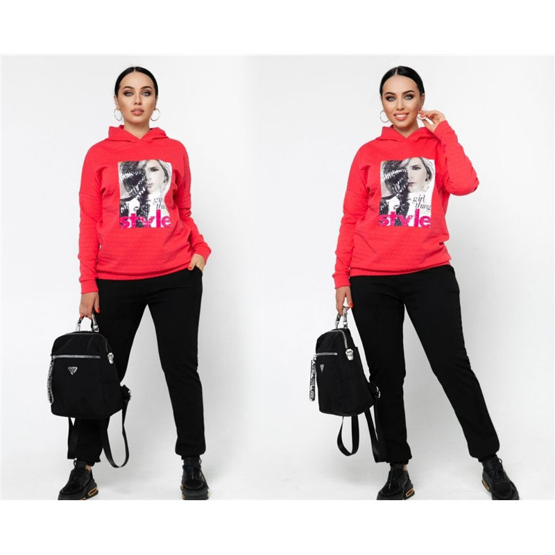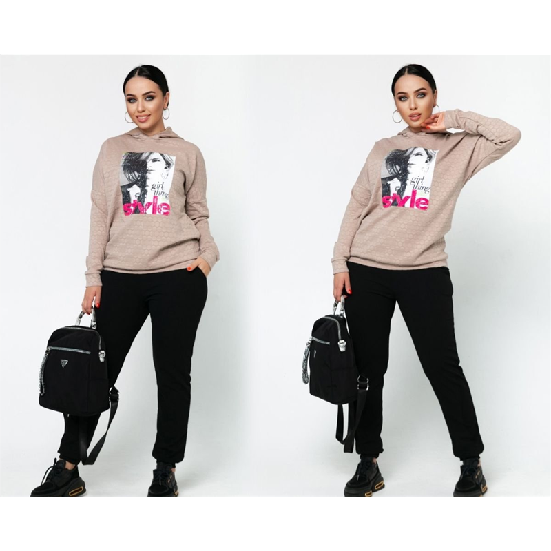 Размер: 46-48 Костюм двойка Удобный спортивный костюм. Кофта с капюшоном + аппликация. Брюки с карманами , на манжете. Ткань: трикотаж хорошая растяжимость Длина кофты : 74 см. Длина рукава: 76 см. ( от горловины) Длина брюк : 105 см. (пояс на резинке) модель 6913-1