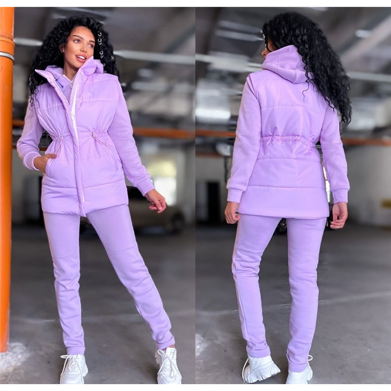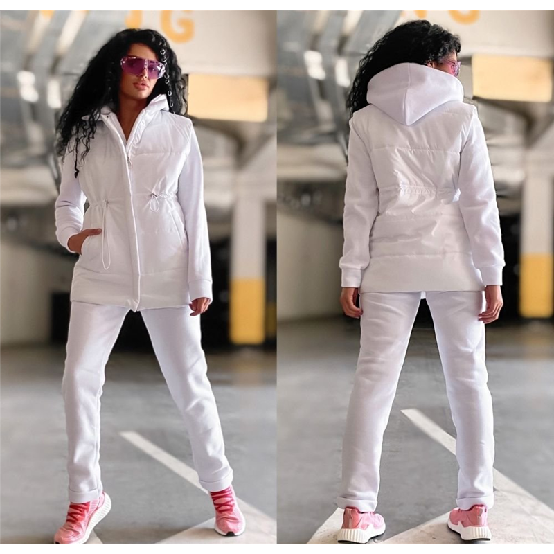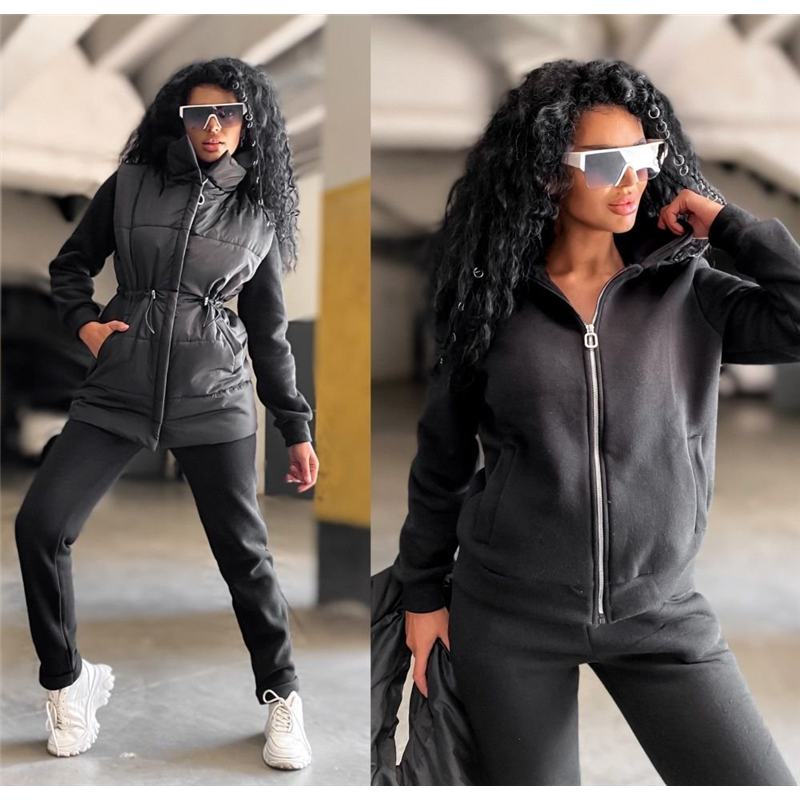 Размер: 42-44, 46-48 Костюм "тройка" Кофта 59 см, рукав 62 см, штаны 104 см. Жилетка 74 см, по талии затягивается шнурком на кулиске. Кофта ог от штаны от об ог/от/об Размер 46-48 кофта: ог 57 см, от 57см, штаны: от 52 см, об 54 см. Жилетка: ог/от/об 59 см Ткань: желет- плащевка "канада" + синтепон 200, костюм- трехнитка на флисе 540