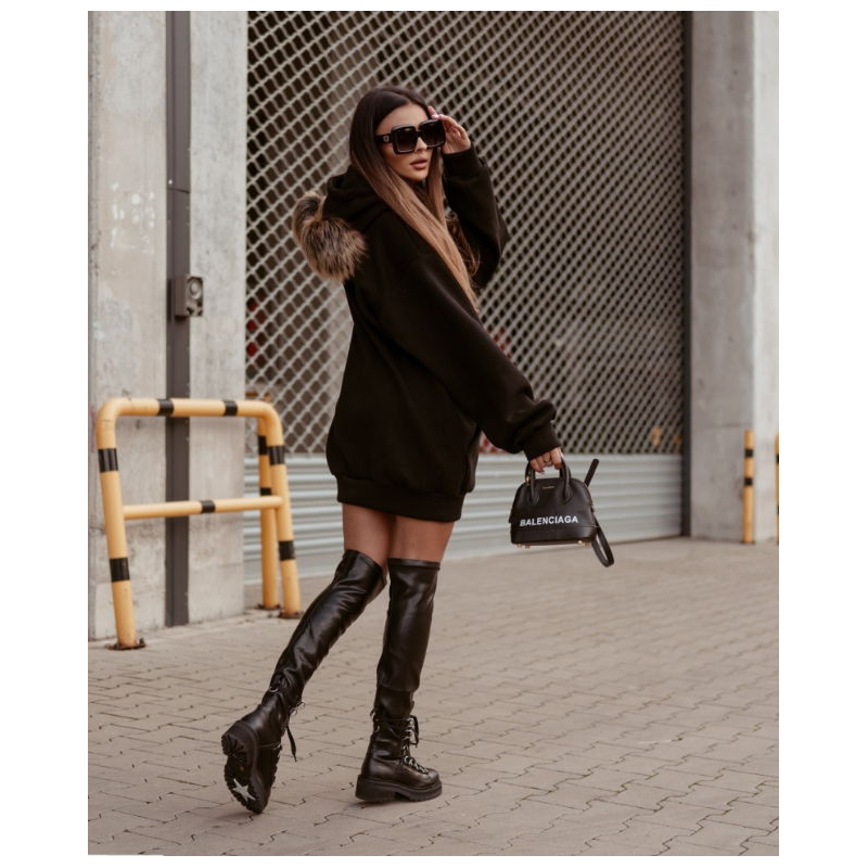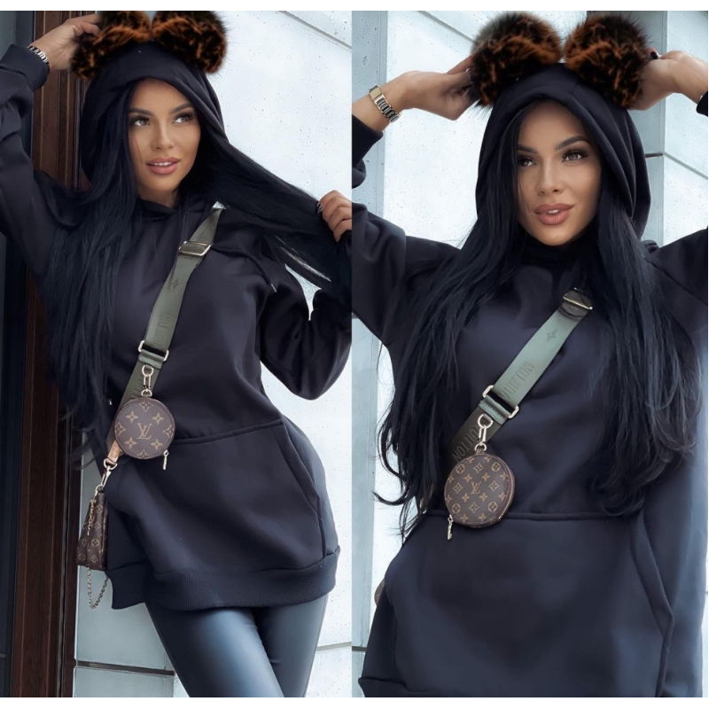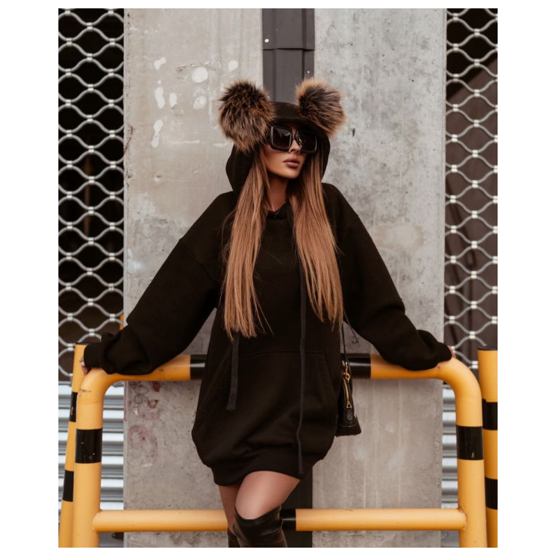 Свободная туника, длинный рукав на манжете, глубокий капюшон с бумбонами, фиксируется канатами в цвет изделия, спереди глубокий карман-кенгуру, спущенный рукав, по низу изделия манжета. На капюшоне съёмные, бежевые бумбоны( диаметр 8см).
